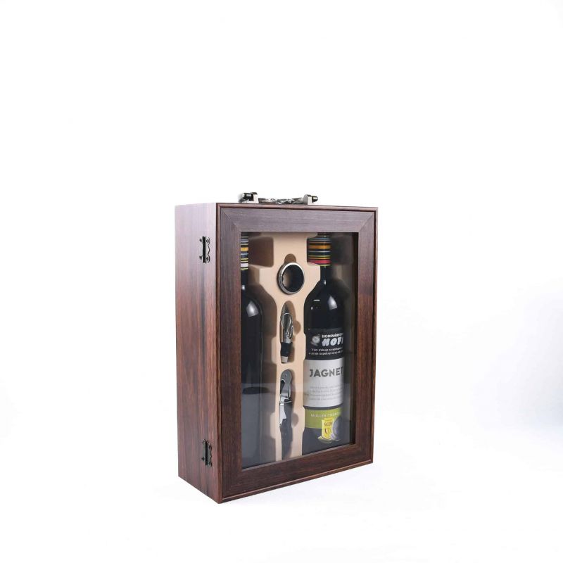 Elegantná drevená kazeta na dve fľaše vína s praktickými doplnkami.