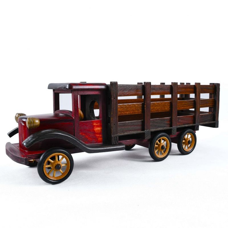 Masívny drevený model nákladného auta typu „Truck“ je ručne vyrobený s dôrazom na detail a klasický dizajn. Kabína v tmavočervenej farbe so zlatými akcentmi, šesť kolies s gumovými pneumatikami a realistická korba z drevených latiek vytvárajú autentický vzhľad. Ideálny ako dekorácia, darček alebo zberateľský kúsok pre fanúšikov vintage techniky a ručnej práce.
