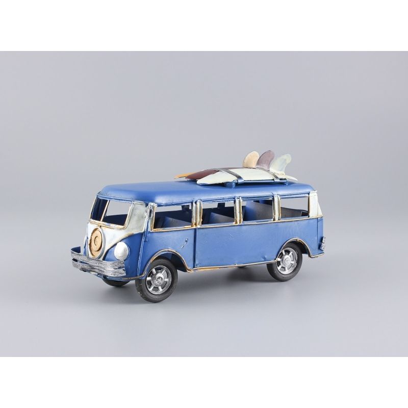 Kovové auto – VW T1 Bulli s trojicou surfov. Dekoratívny kovový model VW T1 Bulli v modro-bielom retro prevedení s trojicou surfov na streche. Detailne spracovaná karoséria s typickým rozdeleným čelným sklom, chrómovými svetlami, bočnými oknami a strešným nosičom evokuje atmosféru letných výletov, surfovej kultúry a dobrodružstva. Ideálny ako štýlová dekorácia, darček pre milovníka klasických vozidiel alebo tematický doplnok do interiéru.