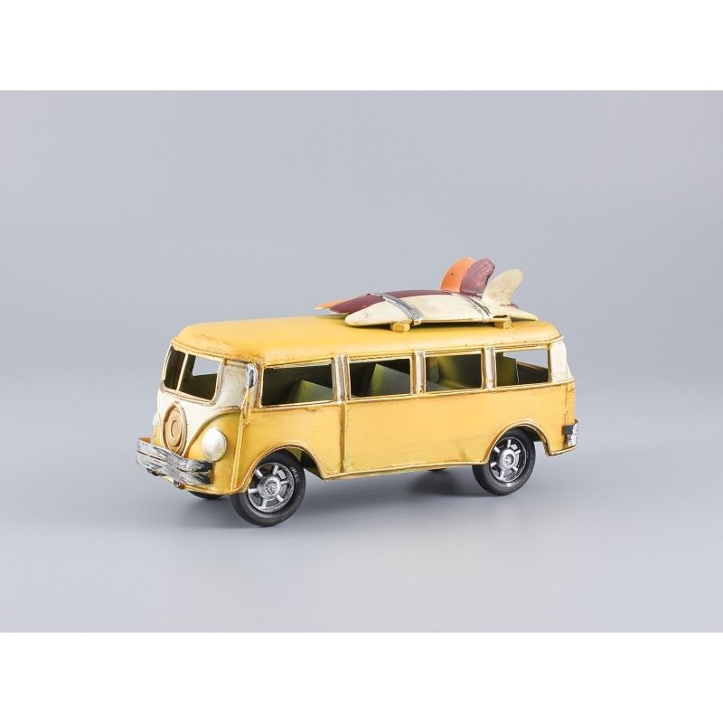 Kovové auto – VW T1 Bulli so surfmi. Dekoratívny kovový model legendárneho VW T1 Bulli v žlto-bielom retro prevedení s trojicou farebných surfov na streche. Detailne spracovaná karoséria s typickým rozdeleným čelným sklom, chrómovými svetlami, bočnými oknami a strešným nosičom evokuje atmosféru letných výletov a surfovej kultúry. Ideálny ako štýlová dekorácia, darček pre milovníka klasických vozidiel alebo tematický doplnok do interiéru.