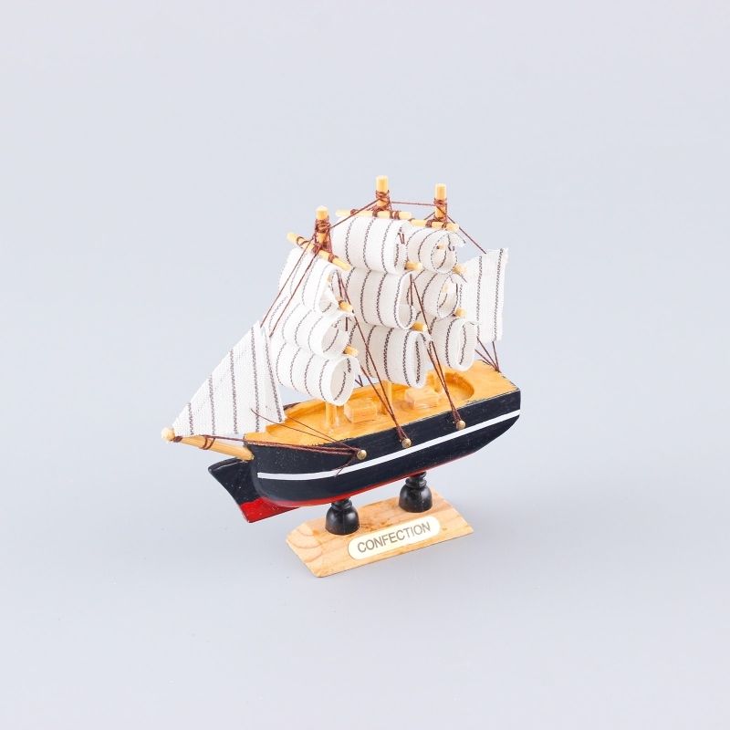 Ručne vyrobený model trojsťažňovej plachetnice „CONFECTION“ s trupom v kombinácii naturálneho lakovaného dreva, čierneho pásu a červeného spodku. Paluba je svetlá, plachty biele s červeným šitím, výplet je spracovaný z tenkého špagátu. Loď je osadená na medovo žltom podstavci s dvoma čiernymi stĺpikmi a mosadzným štítkom. Výška vrátane podstavca je cca 11 cm, dĺžka približne 10 cm, šírka cca 3 cm. Vhodná ako drobná dekorácia na pracovný stôl, poličku alebo do vitríny.