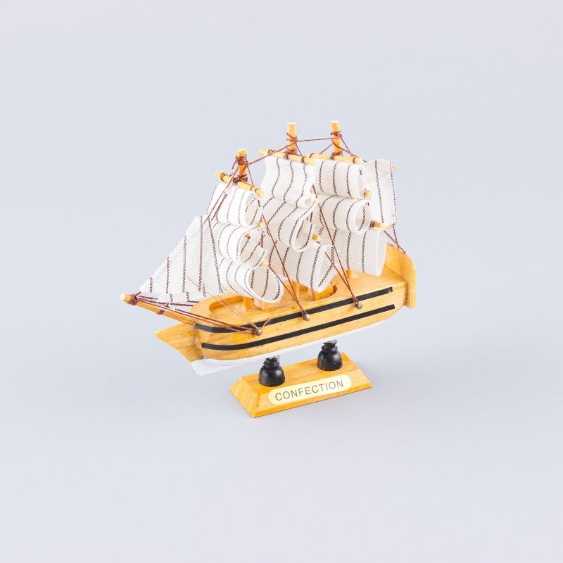 Ručne vyrobený model trojsťažňovej plachetnice „CONFECTION“ s trupom z naturálneho dreva ošetreného lodným lakom, doplnený o čierny pás a jemné detaily. Plachty sú biele s hnedým šitím, výplet je spracovaný z tenkého špagátu. Loď je osadená na medovo žltom podstavci s dvoma čiernymi stĺpikmi a mosadzným štítkom. Výška vrátane podstavca je cca 11 cm, dĺžka približne 10 cm, šírka cca 3 cm. Vhodná ako drobná dekorácia na pracovný stôl, poličku alebo do vitríny.