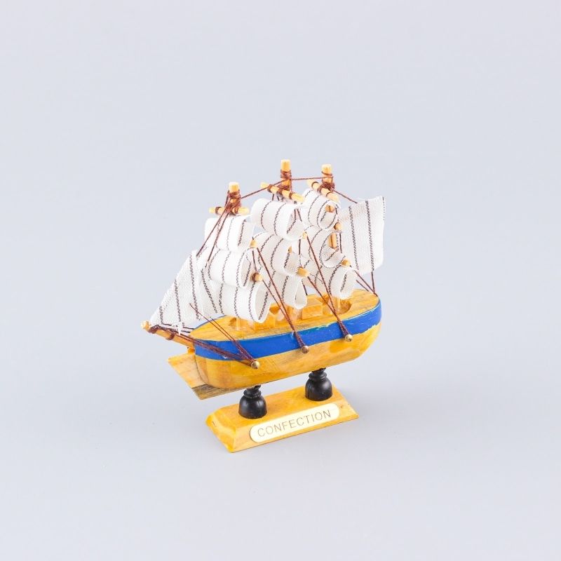Ručne vyrobený model trojsťažňovej plachetnice „CONFECTION“ s trupom v kombinácii bielej farby, modrého pásu a naturálneho lakovaného dreva. Plachty sú biele s červeným šitím, výplet je spracovaný z tenkého špagátu. Loď je osadená na medovo žltom podstavci s dvoma čiernymi stĺpikmi a mosadzným štítkom. Výška vrátane podstavca je cca 10 cm, dĺžka približne 9 cm, šírka cca 3 cm. Vhodná ako drobná dekorácia na pracovný stôl, poličku alebo do vitríny.