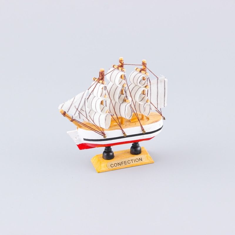 Ručne vyrobený model trojsťažňovej plachetnice „CONFECTION“ s trupom v kombinácii bielej, červenej a čiernej farby. Plachty sú biele s červenými a čiernymi pruhmi, výplet je spracovaný z tenkého špagátu. Loď je osadená na žltom podstavci s dvoma čiernymi stĺpikmi a mosadzným štítkom. Výška vrátane podstavca je cca 10 cm, dĺžka približne 9 cm, šírka cca 3 cm. Vhodná ako drobná dekorácia na pracovný stôl, poličku alebo do vitríny.