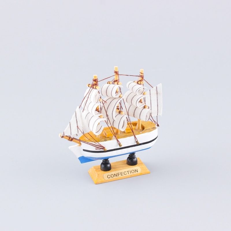 Ručne vyrobený model trojsťažňovej plachetnice „CONFECTION“ s trupom v kombinácii bielej farby, modrého pásu a naturálneho lakovaného dreva. Plachty sú biele, výplet je spracovaný z tenkého špagátu. Loď je osadená na drevenom podstavci s mosadzným štítkom. Výška vrátane podstavca je cca 10 cm, dĺžka približne 9 cm, šírka cca 3 cm. Vhodná ako drobná dekorácia na pracovný stôl, poličku alebo do vitríny.