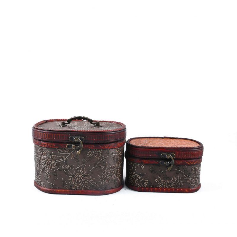 Ručne vyrobená sada dvoch dekoratívnych boxov s reliéfnym kvetinovým vzorom, červeným rámovaním a kovovým kovaním. Vďaka zaoblenému tvaru, detailnému spracovaniu a vintage vzhľadu sú ideálne na šperky, drobnosti alebo ako štýlový doplnok do interiéru.