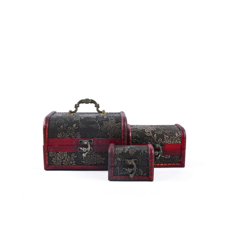 Ručne vyrobená sada troch dekoratívnych boxov s vintage motívom – kombinácia čierneho reliéfu, červeného rámovania a starožitného kovania vytvára elegantný a nostalgický vzhľad.