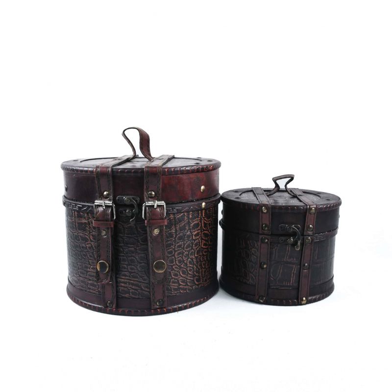 Súprava zdobených úložných boxov s koženými popruhmi (2 ks).