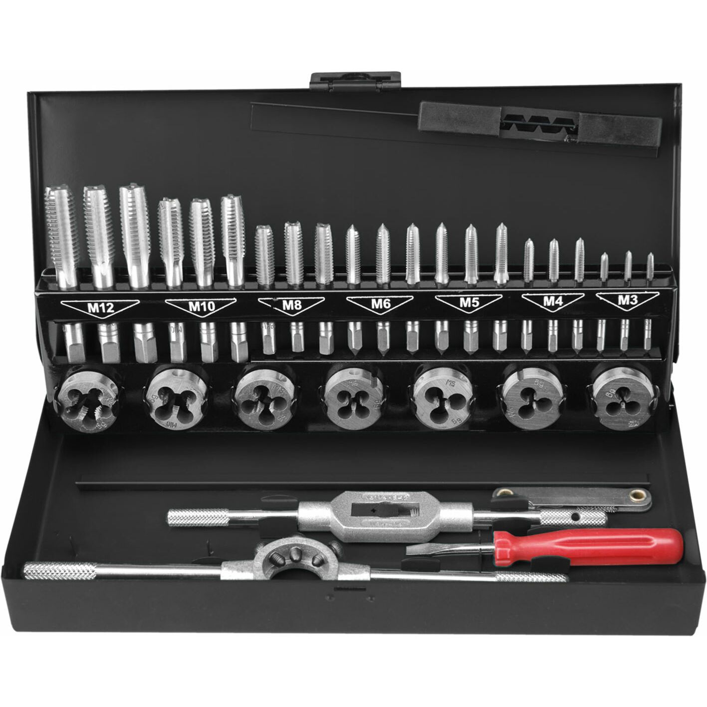 Závitníky a závitové očká HSS, 32-dielna sada, M3-12, kovové puzdro, EXTOL PREMIUM